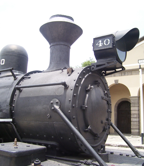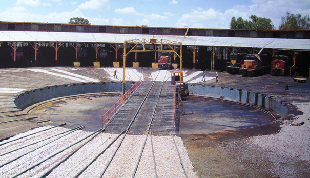 Casa de máquinas. Edificación de trabajo en forma de semicírculo que cuenta con una mesa giratoria a través de la cual las locomotoras* son trasladadas para su reparación a los diversos departamentos del taller*.