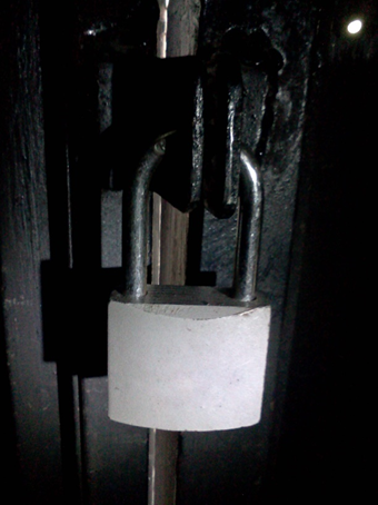 Cerradura suelta colocada dentro de una caja metálica provista de un pasador o pestillo en forma de gancho que se pasa por armellas fijas en las puertas o muebles que se han de cerrar.