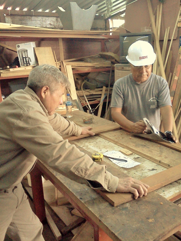 Trabajadores que hacían labores de mantenimiento en coches* y carros* atendiendo las partes de madera de esos equipos.