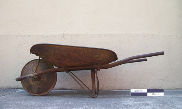 Carrito de mano hecho de hierro con una sola rueda y, en algunos casos, con otras dos de pequeñas dimensiones.