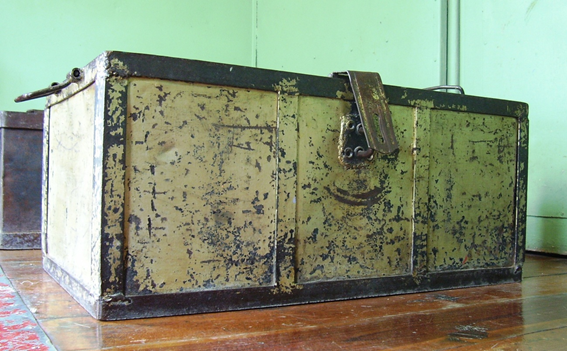 Mueble de metal con puertas y anaqueles, dotada con cerradura que se abre al marcar una combinación numérica. Se utiliza para guardar dinero y otros valores.
