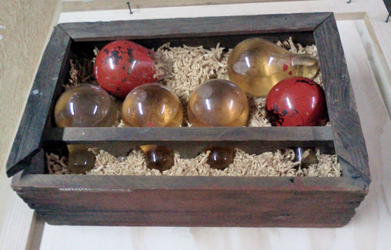 Es una caja de madera cuya cara frontal es de cristal y en su interior aloja bombillas contra incendio*. El contenedor permanecía fijo en una pared y en caso de incendio debía romperse el cristal de la caja para tomar las bombillas.