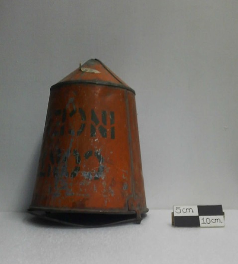 Este objeto sirvió para la recolección y aplicación de agua, tierra o cualquier otra sustancia útil para apagar el fuego. La singular forma cónica en la base de esta cubeta propició su utilización exclusiva para apagar incendios.
