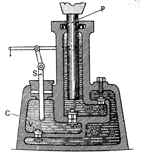 Gato hidráulico: S, émbolo de accionamiento; P, émbolo elevador; A. B, C, cámaras; V1, válvula de elevación que permite el paso del aceite; V2, válvula de elevación que permite el paso del aceite de C a B durante la carrera de descenso de S; V3, valvula de descarga para la carrera descendente de P.