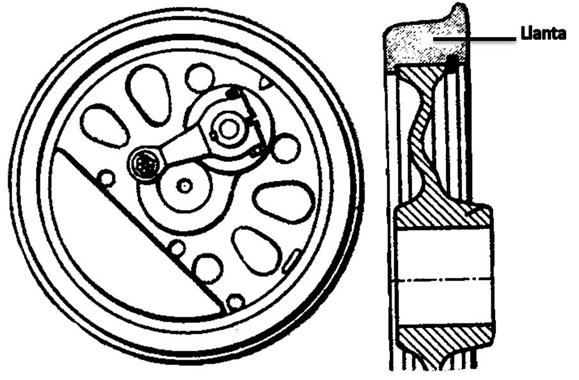 Banda de acero de una rueda de locomotora* que cubre la parte periférica que entra en contacto con el riel*.