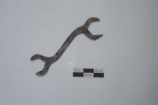 Llave con dos cabezas. Fue utilizada en los talleres* mecánicos de los ferrocarriles* mexicanos, su uso era variado, se empleó para el mantenimiento de carros*, locomotoras*, máquinas de talleres* e incluso para la reparación de vías*.